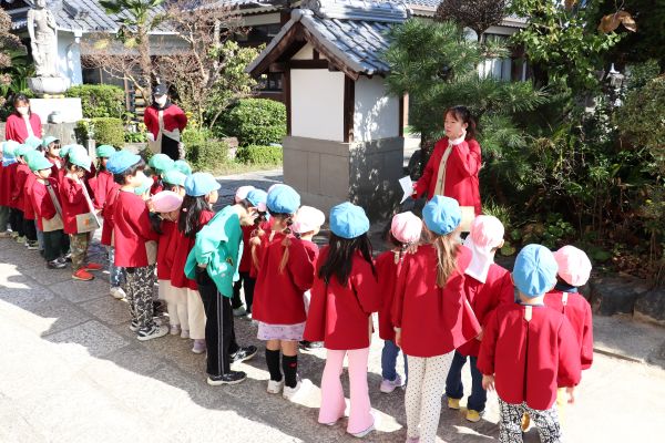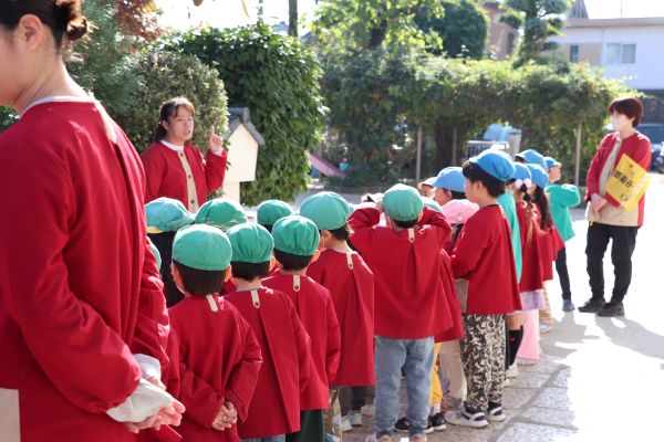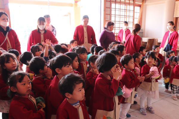 七五三のお祝いの意味を知り、大きくなったことを喜ぶためみんなで神社にお参りに出かけました。